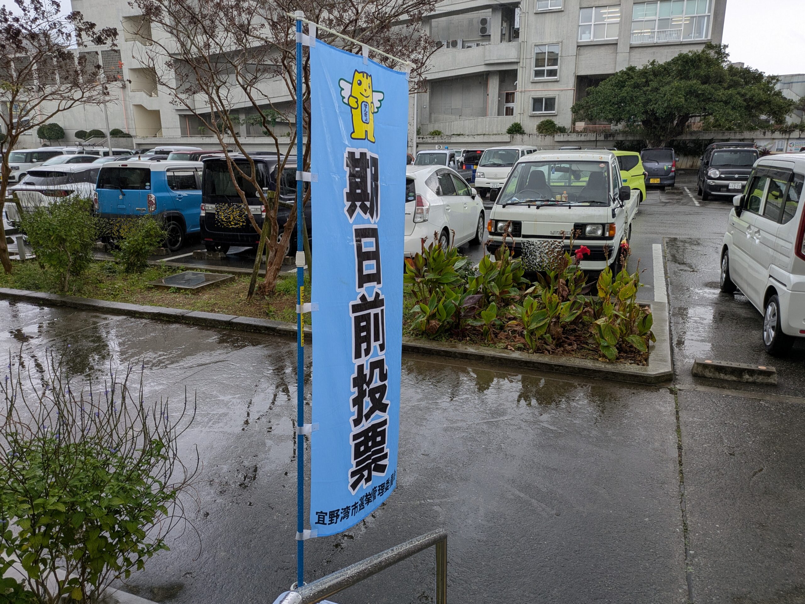 ・宜野湾市役所前到着です。確定申告で使う建物が投票所に割り当てされてました。なお当市役所の駐車スペースは狭いのですが、意外にも余裕で駐車できました。