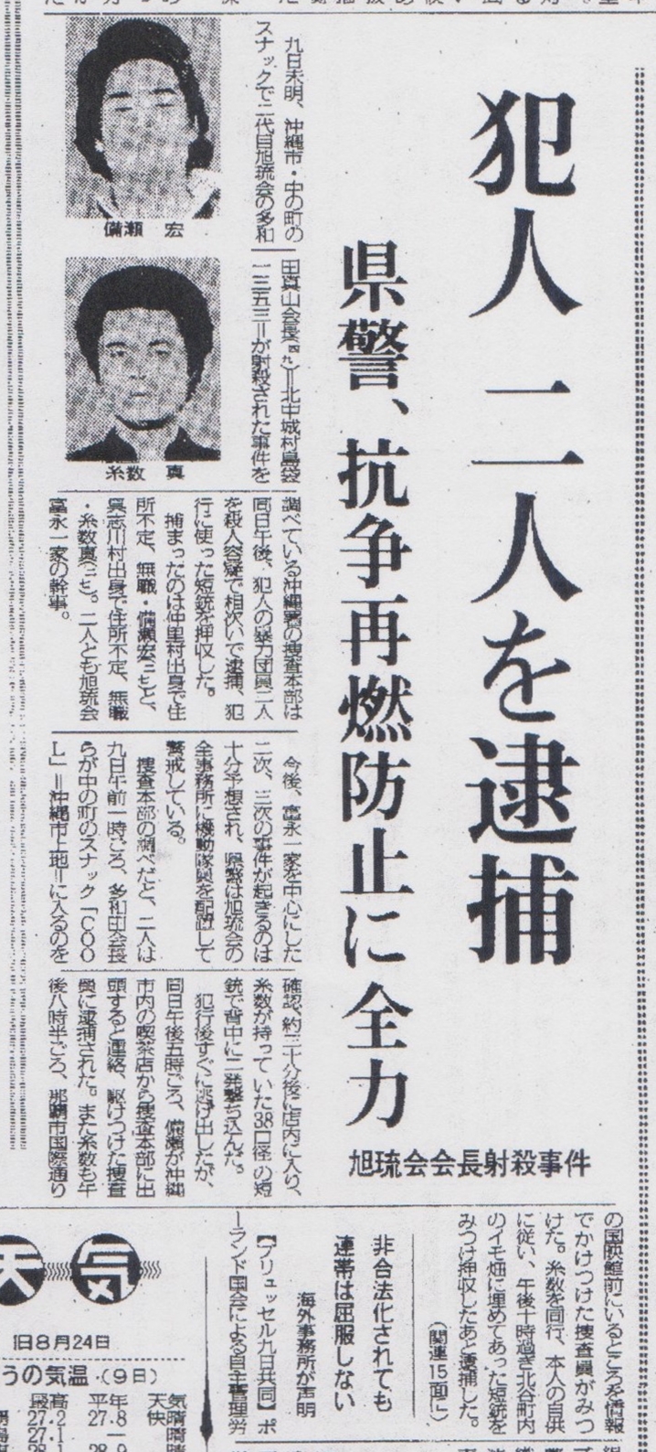 (続く)前回の記事において、糸数真會長の青年時代の経歴について言及しましたが、今回は皆さん(特に党運営ブログの読者であれば)ご存じの昭和57年(1982)10月9日未明の多和田真山旭琉会会長(当時)射殺事件について触れます。