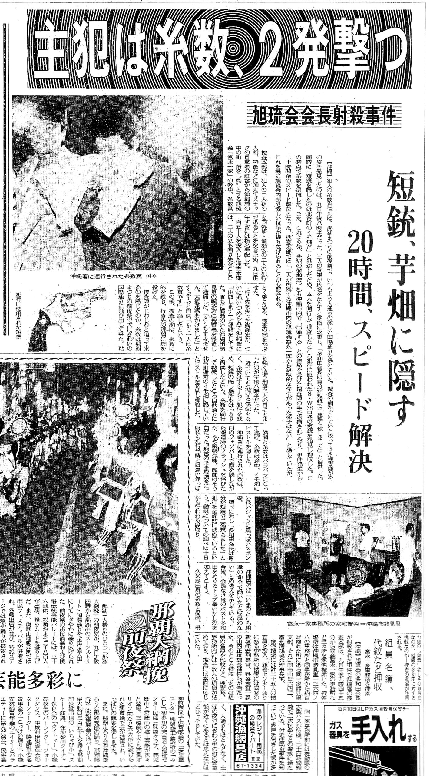 この事件はついうっかり(意訳)とはいえ、沖縄社会に与えた衝撃は大きく、主犯の富永一家幹事(当時)糸数青年はド派手な全琉デビューを果たします。それでは琉球新報朝刊1面※に掲載された糸数真さんの若き日のご尊顔をご参照ください。