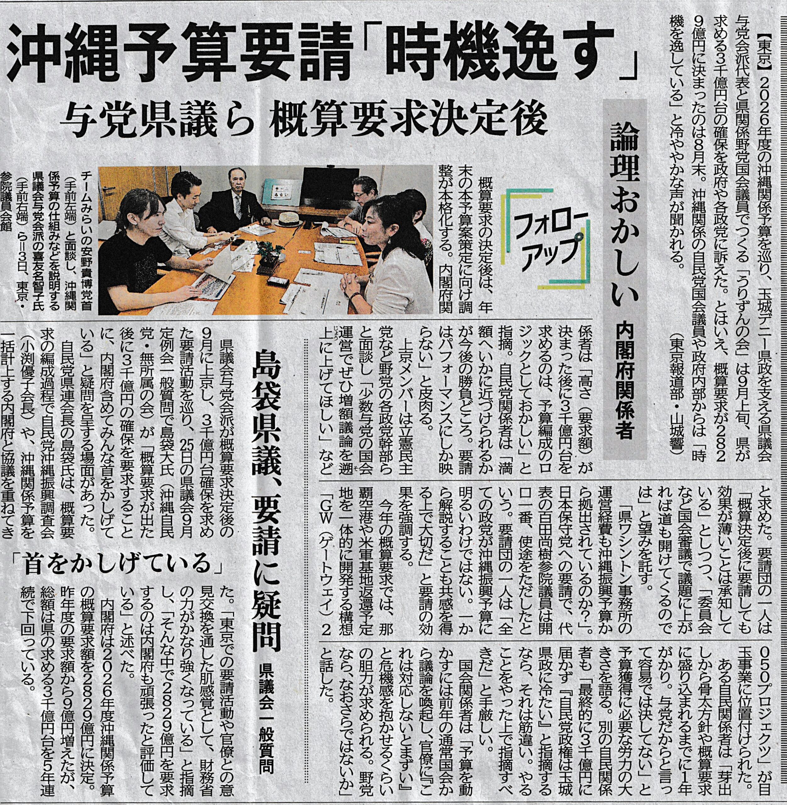 最後に目的と手段が入れ替わってしまった政治家はこんな無様な失態をやらかす例を紹介して今回の記事を終えます(令和07年9月29日付沖縄タイムス1面)