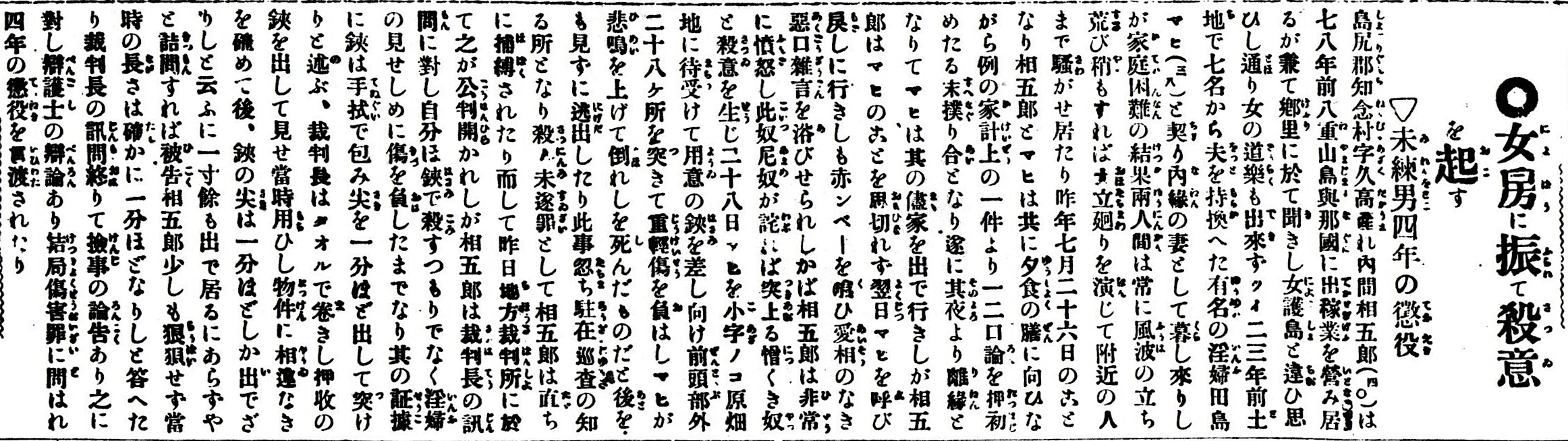 愛相のなさ悪口雑言を浴びせられしかば、相五郎は非常に憤怒し「此奴尼めが詫れば突上る憎くき奴」と殺意を生じ、二十八日マヒを小字ノコ原畑地に待受けて用意の鋏を差し向け、前頭部他二十八ヶ所を突きて重軽傷を負はし、マヒが悲鳴を上げて倒れしを死んだものだと後も見ずに逃出したり。此事忽ち駐在巡査の知る所となり、殺人未遂罪として相五郎は直ちに捕縛されたり。而して昨日地方裁判所に於(おい)て之が公判開かれしが、相五郎は裁判長の尋問に対し「自分は鋏で殺すつもりではく