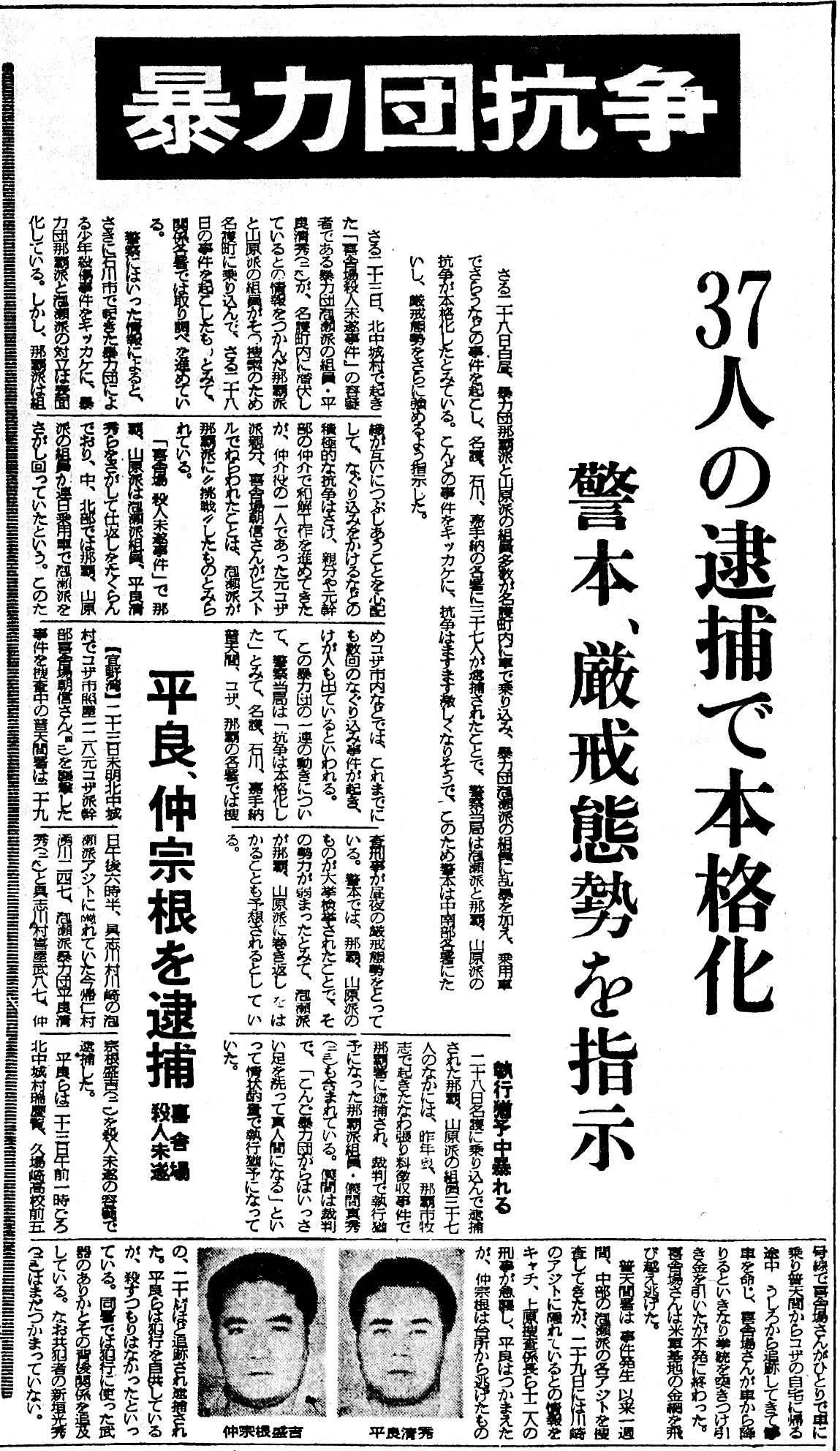 泡瀬派の殺し屋にたいし、山原派のある幹部は「山原派にも行動派は多い」と反ばくして「昨年2月、山原派組員・具志堅弘、上原秀吉らが短刀やコン棒で泡瀬派の親分、喜屋武盛一(26)と幹部、比嘉政勇を襲い、袋だたきにしたが、山原派にはそのような行動派はいくらでもいる」とうそぶいていた。