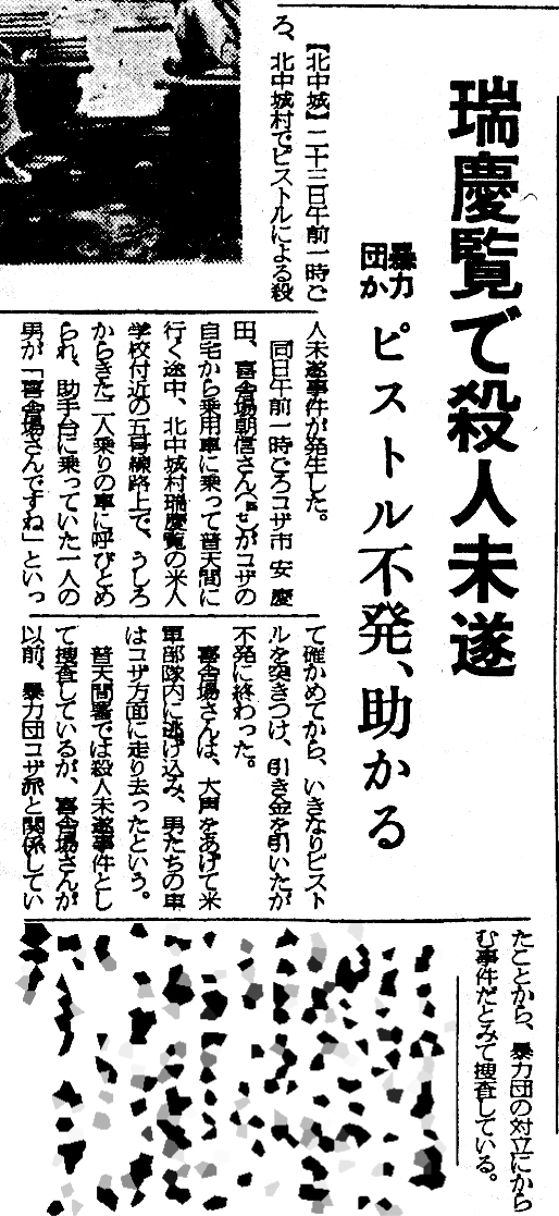 なおこの記事は事実関係が(一部)不正確で、正しくは「普天間の田場盛孝宅から自宅に帰宅しようとした途中、瑞慶覧の久場崎ハイスクールあたりで、後続の車にバッシングされ停車を余儀なくされた喜舎場が、車から降車後に銃撃されるも不発のため……」という流れです。ちなみに喜舎場がなぜ普天間の田場宅にいたかというと、同年4月10日の泡瀬派による那覇派組員刺殺事件に関して、泡瀬派との那覇派の仲介役として参加していたからです。